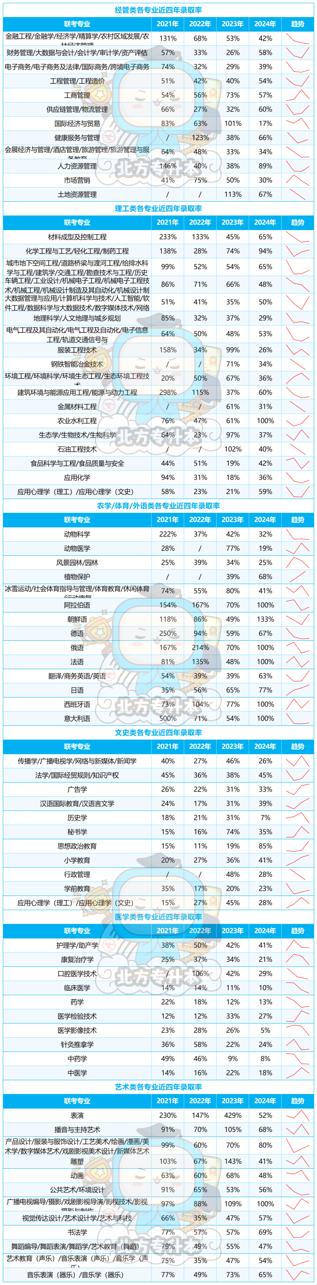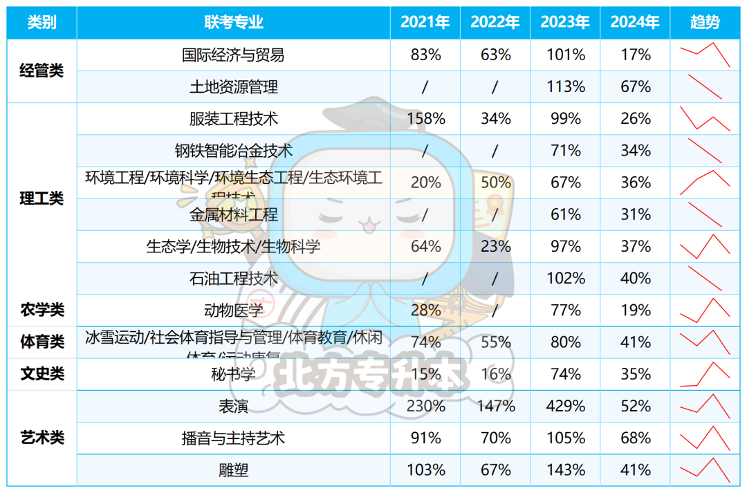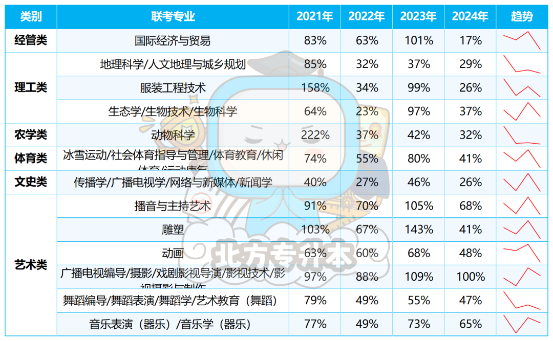 从2021-2024年的数据来看,有13个专业的录取率均呈现降-涨-降的趋势。