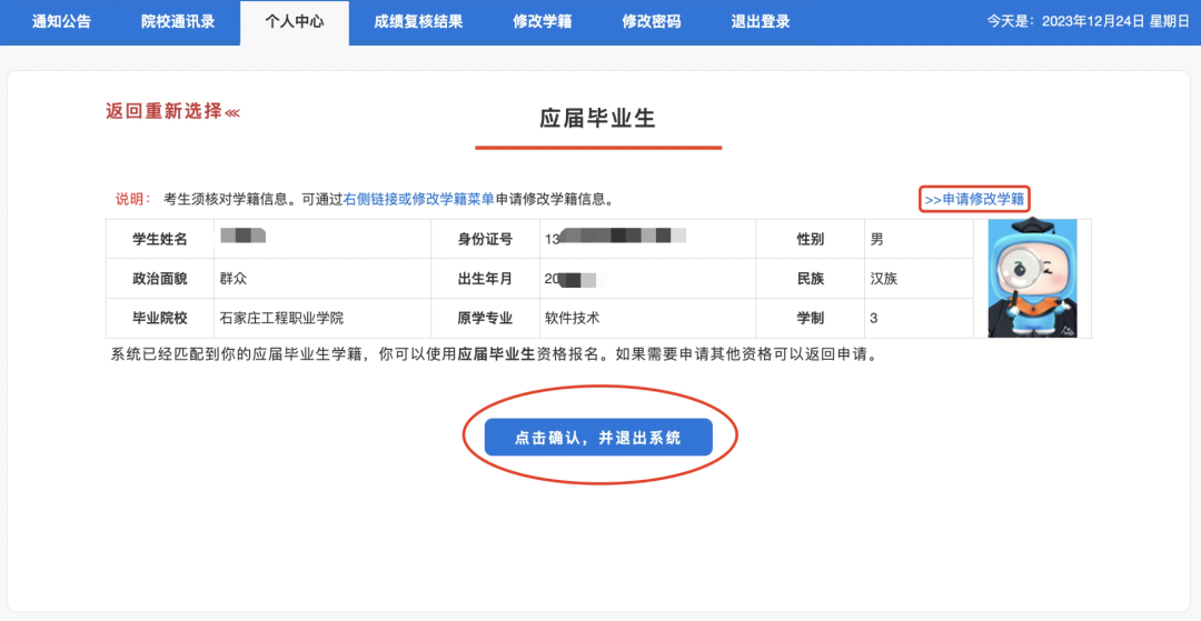 *如需修改学籍信息,可通过右侧链接或修改学籍菜单申请修改学籍信息
