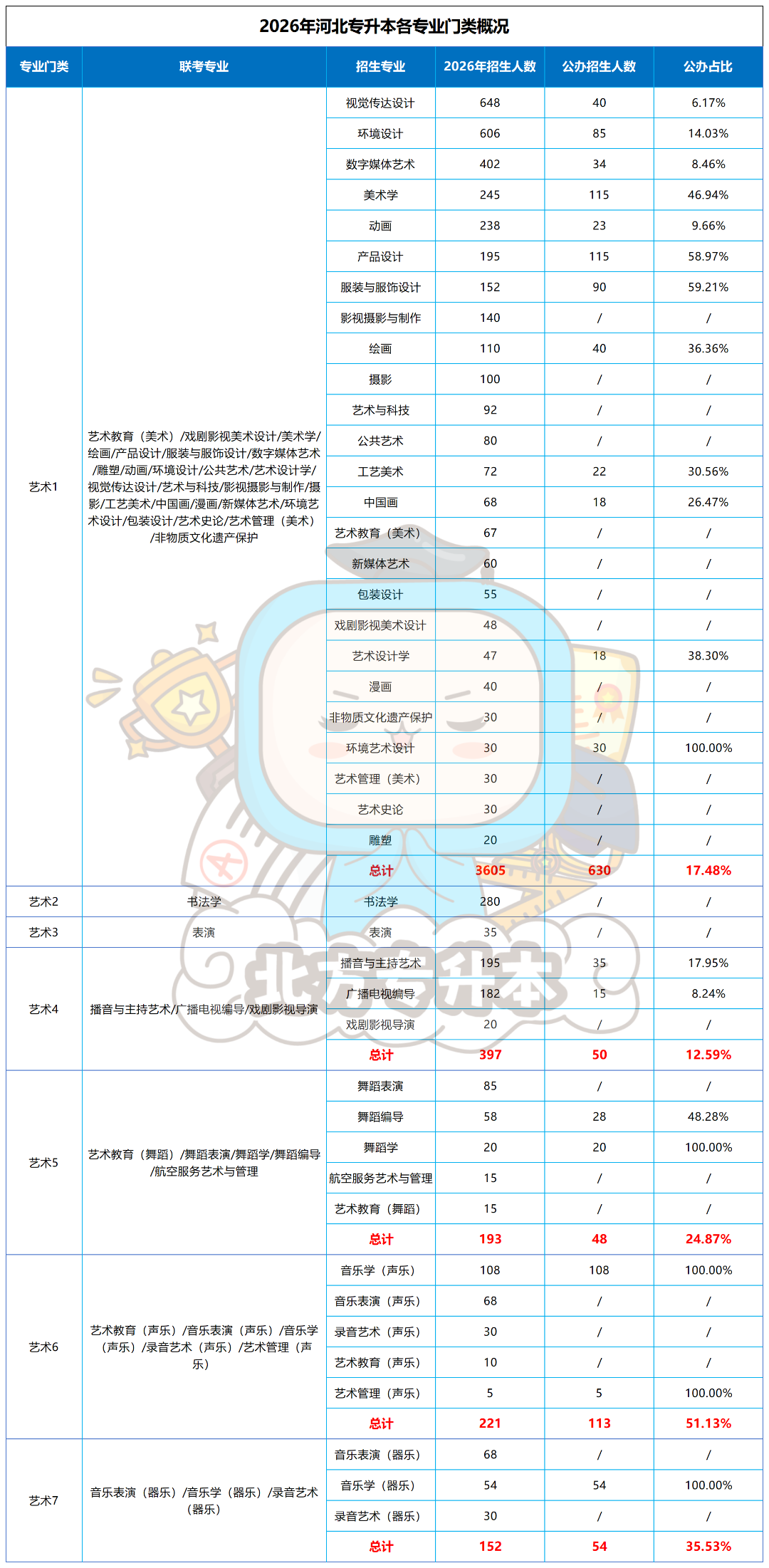 ▶从公办招生名额来说,艺术1公办招生最多,有630个,从公办招生占比来说,艺术6公办招生占比51.13%。